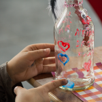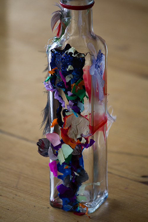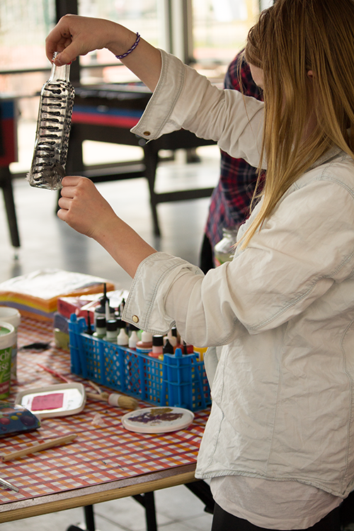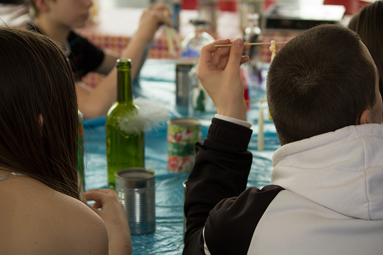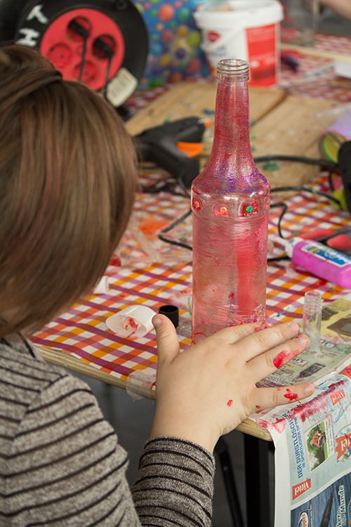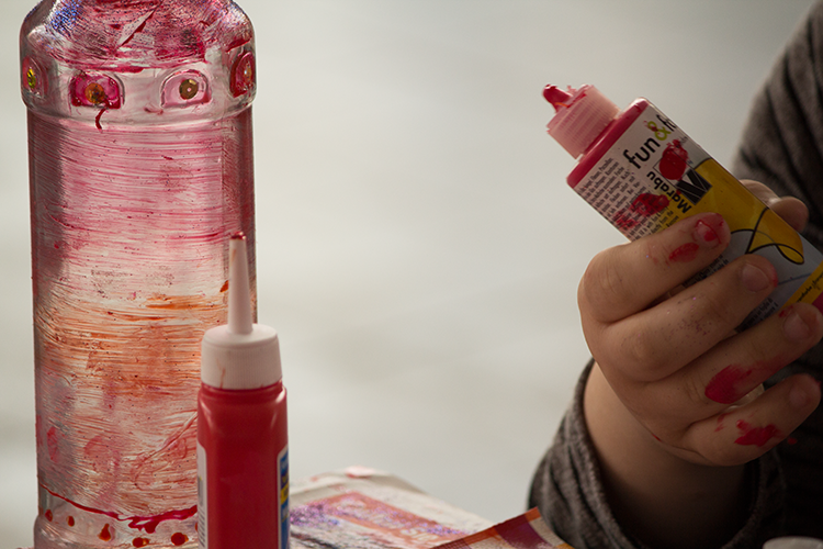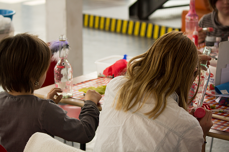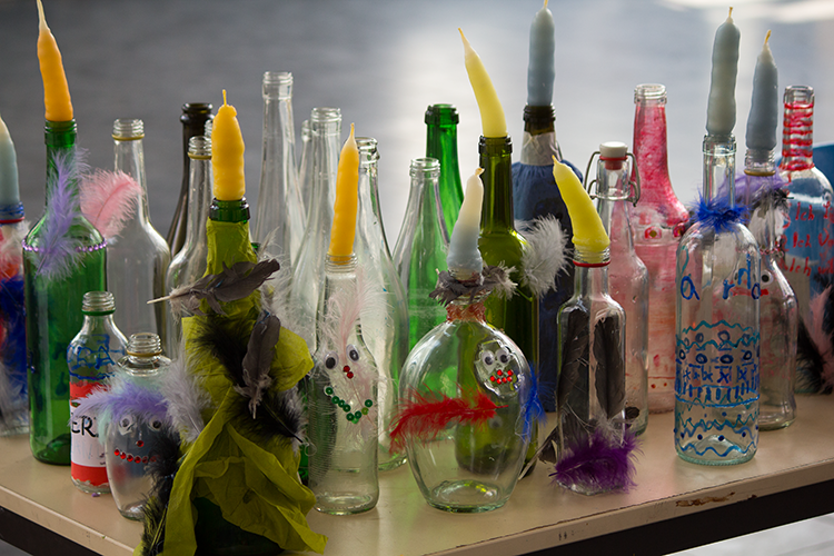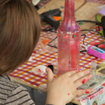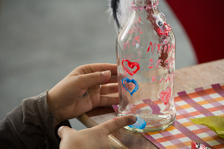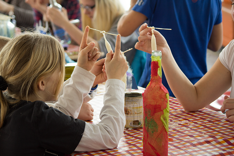 Ein paar Spiele an der frischen Luft haben uns alle dann vollends wach gemacht. Das gute Wetter musste ja auch genossen werden, bevor es zum Basteln wieder nach drinnen ging. Das Kerzen ziehen hat zwar die Geduld etwas herausgefordert, aber am Ende hatten alle Kids eine schöne Kerze. Kreativ austoben konnten sie sich dann beim Verzieren der Flaschen als Kerzenständer. Nächstes Mal besorgen wir besser mehr Federn und Wackelaugen, denn die gingen weg wie nichts.