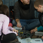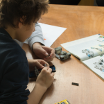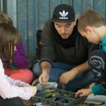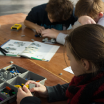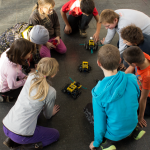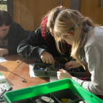 In kleinen Gruppen machten sich die Kinder ans Werk und versuchten nach einer Anleitung die Grundstruktur ihres fahrbaren Roboters zu bauen: „Gib mal ’nen Vierer! Ey das passt da gar nicht hin, das kommt doch erst auf Seite 2. Auf jeden Fall braucht er Flügel und Glitzer.“ Es wurde zusammen überlegt, gebaut und Probleme gelöst und am Ende hatten wir drei funktionierende Roboter.