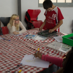 Um Punkt 10 Uhr waren dann plötzlich rund 30 Escu-Kids um die Tafel versammelt und nachdem alle ihren Hunger gestillt hatten schnappte sich Hannah unsere kleine Sarah, die zum ersten Mal auch ihre Hausaufgaben mitgebracht hatte und half ihr dabei. Ich (Leli) und Eva übernahmen den langweiligen Part und stapelten das schmutzige Geschirr in der Spülmaschine während Otto-Chris, Cap-Chris und Sascha unseren Sinnesworkshop einleiteten.