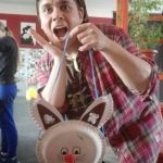 Währenddessen wurden dekorative Ostereier mit einer Luftballon-Garn-Kleister Technik fabriziert und am Tisch gegenüber konnten die Kids aus drei Papptellern und etwas Fantasie kleine Osterhasentaschen basteln, die sich auch prima zum Sammeln von Ostereiern und Schokolade eignen sollten, doch dazu später mehr.